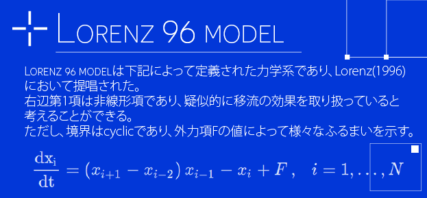 $\frac{\rm{d}x_i}{\rm{d}t} = \left(x_{i+1}-x_{i-2}\right)x_{i-1}-x_i + F_i,\ \ \ i=1,…,N$